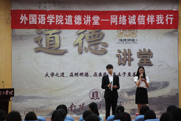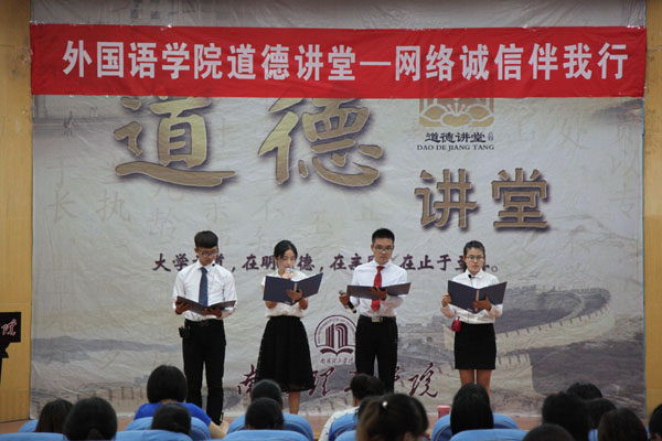 为了加大网络诚信教育力度,将中华民族传统美德从现实层面推进到虚拟世界,建设和维护网络社会诚信生态,外国语学院于6月24日下午在图书馆二楼报告厅举行了以“网络诚信伴我行”为主题的道德讲堂。学院全体教职工和学生参加了本次活动。