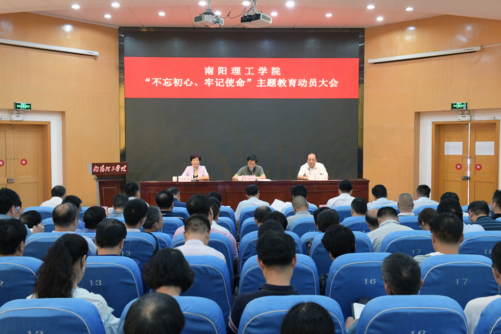 9月11日下午,南阳理工学院在领创空间学术报告厅召开“不忘初心、牢记使命”主题教育动员大会,深入贯彻落实习近平总书记在“不忘初心、牢记使命”主题教育工作会议上的重要讲话精神,对全校主题教育活动进行全面动员和部署。省委第十一巡回指导组副组长、省林业局副巡视员李灵军出席会议并讲话,校党委书记邢勇作动员讲话。省委第十一巡回指导组成员王明玉、韩海军、雷浩然出席会议。全体校领导、全体中层正职、中层副职党员干部、全体辅导员、专职组织员、各党支部书记、学生党员代表参加会议。校长刘荣英主持会议。