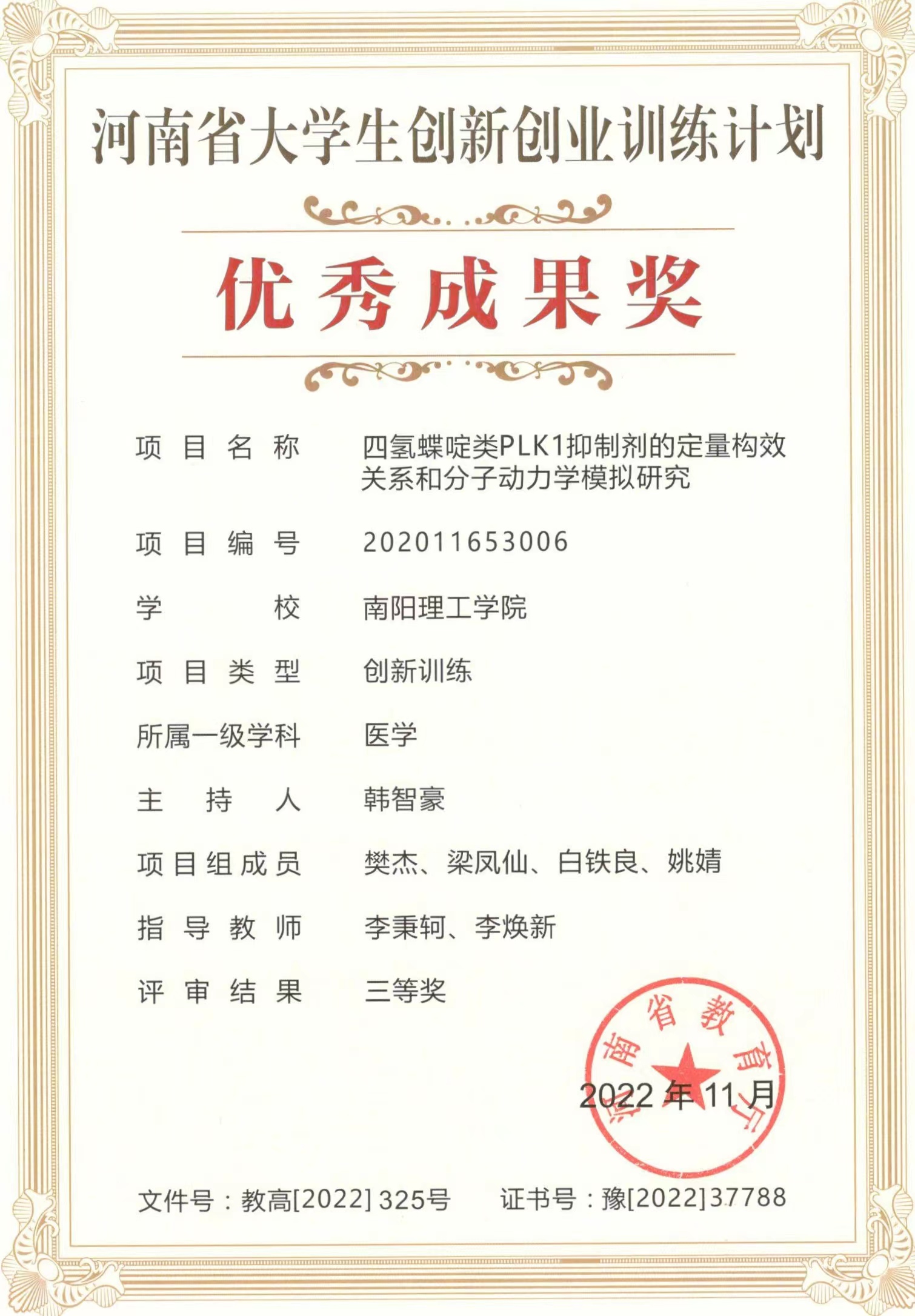 本网讯(记者/杨丹丹)日前,河南省教育厅下发了2021年度大学生创新创业训练计划优秀成果奖证书,我校《四氢碟啶类PLK1抑制剂的定量构效关系和分子动力学模拟研究》和《细胞壁结构变化在豫西南寺庙建筑材质研究上的应用及修缮设计》两个项目获得优秀成果奖,充分展示了我校近年来在学生创新创业能力培养方面的成效。